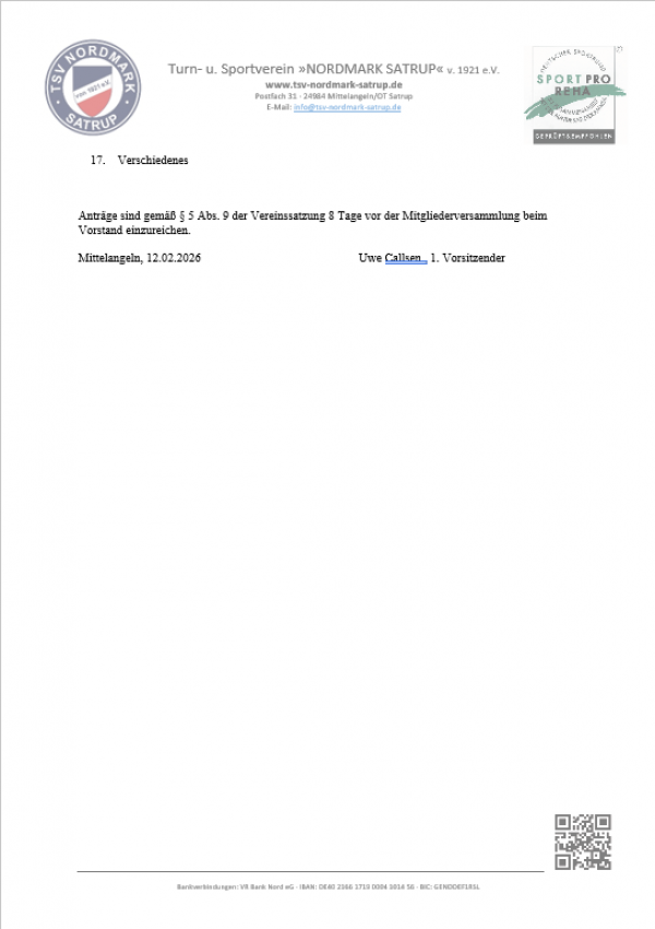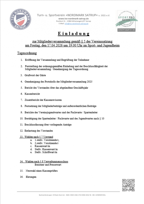 Der Vorstand des TSV Nordmark Satrup lädt seine Mitglieder zur Mitgliederversammlung 2026 ein. Diese findet am 17.04.2026 um 19:00 Uhr im Sport- und Jugendheim im Knud-Redlefsen Stadion statt.