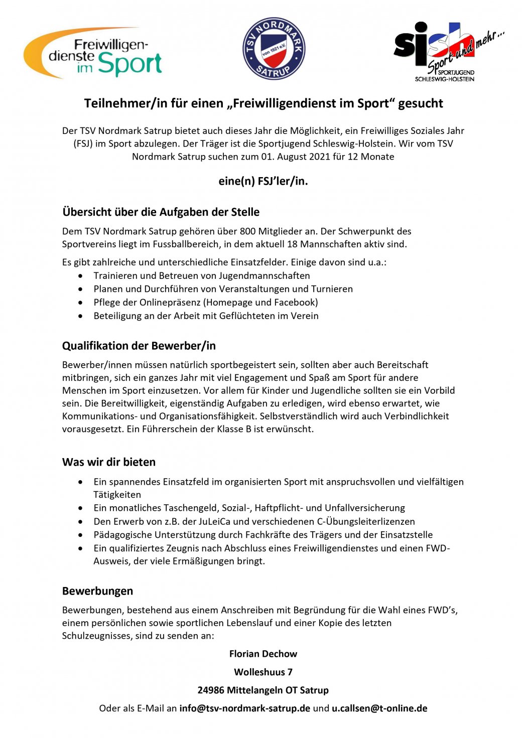 Du bist interessiert an einem FSJ beim TSV Nordmark Satrup? Dann wirf doch einen Blick in das beigefügte Ausschreiben.