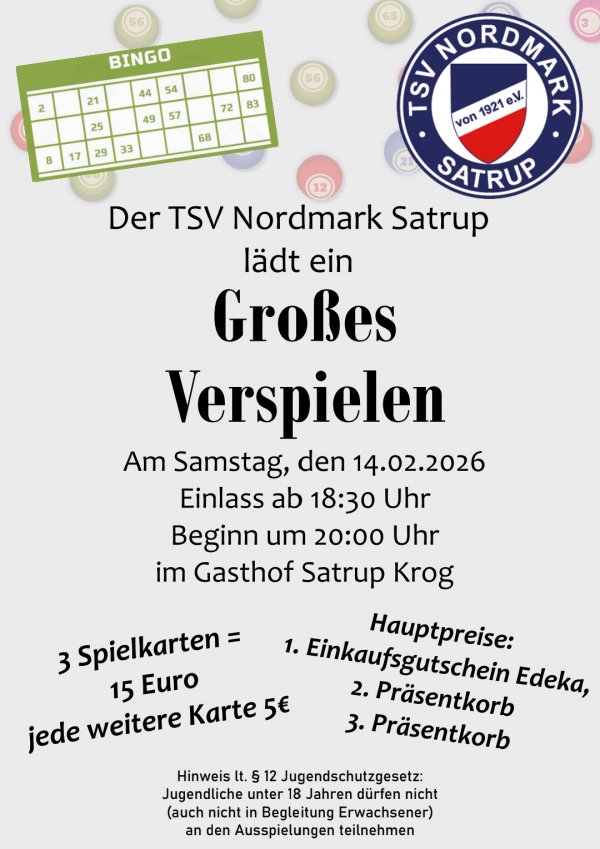 Am 14.02.26 ist es wieder soweit. Das große Verspielen des TSV steht in den Startlöchern. Der Einlass startet 18:30 Uhr und der Beginn ist für 20:00 Uhr geplant.