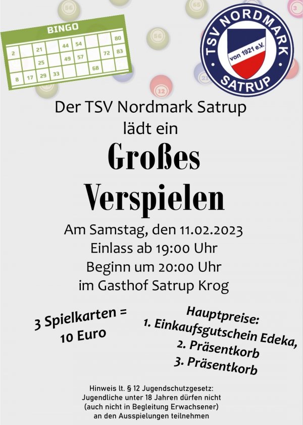 Am Samstag, den 11.02.2023 findet im Satrup Krog das Große Verspielen des TSV statt. Einlass ist ab 19 Uhr und beginn des Verspielens ist um 20 Uhr. Seid dabei und sichert euch die tollen Preise.