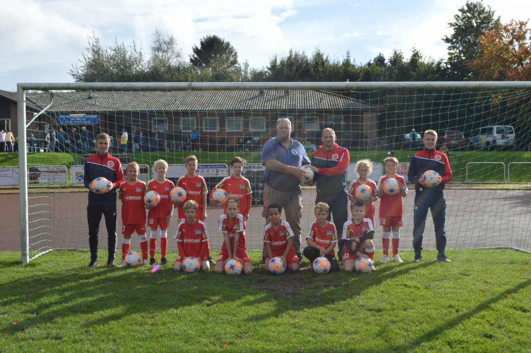 Die E-Jugendmannschaft (oben v. l n. r.: Trainer Nick Kühnel, Joel Kühnel, Tom Gendries, Maart Hansen, Emil Höfer, Hans-Otto „Hosch“ Schmidt, Trainer Florian Dechow, Carl Severus, Bo Petersen, Trainer Jannik Sellmer, unten v. l. n. r.: Theo Seehusen, Max Fiete Molzen, Qusay Kharbouche, Bosse Mangelsen, Maxim Novosiolov) um Trainer Nick Kühnel, Stanley Staschel, Jannik Sellmer und Florian Dechow bedanken sich ausdrücklich für die neuen Bälle und hofft, dass „Hosch“ die Zeit findet, das eine oder andere Spiel der E-Jugend zu begutachten.