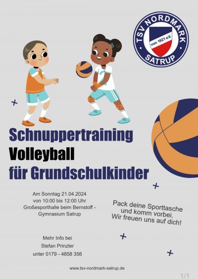 Die Volleyball Sparte lädt zum Schnuppertraining ein. Du bist im Grundschulalter und möchtest mal schauen ob Volleyball etwas für dich ist? Dann komm am 21.04. um 10 Uhr zur Großsporthalle am Schulzentrum Satrup.