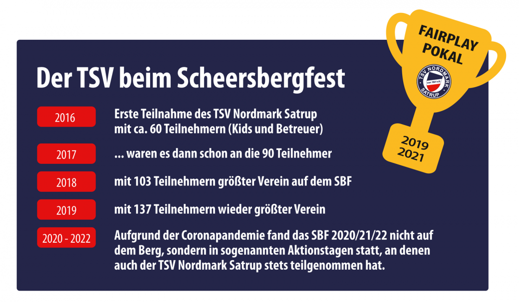 Neben Fussball- und Handballturnieren veranstaltet das Scheersbergfest mit ca. 800 Teilnehmern und über 200 Betreuern und Helfern das größte Völkerballturnier in Norddeutschland. Die Kinder messen sich außerdem in einem Dreikampf im Laufen, im Springen und Werfen und in einem Turnparcours.